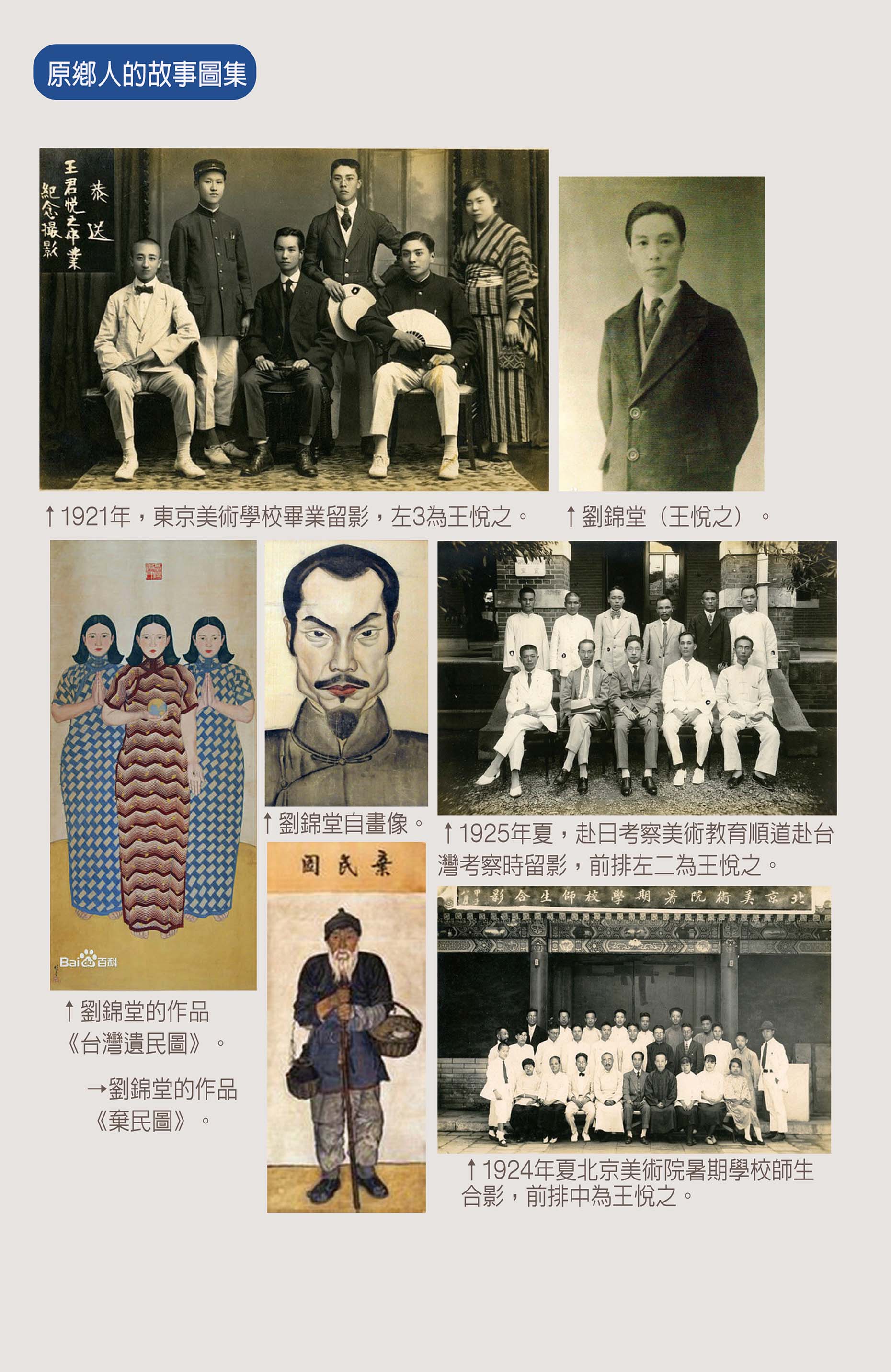 學了五年以後,正好五四運動爆發,我父親受五四運動的影響,很想回國來報效祖國。1920年,我父親知道孫中山先生在上海,就從日本來到上海,求見孫中山,要求參加國民革命,參加國民黨。孫中山先生在辛亥革命之後雖然推翻了滿清,但是連一任大總統也沒有做下來,就讓袁世凱篡權了,所以他當時不在朝,而是在野,住在上海,沒有在京城。得知有位台灣青年求見,孫中山當時就讓他的助手王法勤(也是同盟會的老會員,曾經是留日學生)來接待我父親。王法勤被我父親的愛國熱情所感動,很贊賞這個年輕人,因為台灣青年要求參加國民革命,這在當時還是少見的。但是他不贊成我父親放棄學業參加國民革命,所以就勸他回東京繼續完成學業,還有一年嘛。身邊的同事有人提議,既然你這麼喜歡劉錦堂,就收他為義子吧,將來也好追隨你做點事。這樣,我父親就認王法勤為義父,同時更名改姓,劉錦堂的名字就不再提了,就改為王悅之。隨後又回到了東京,繼續學美術。