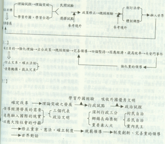 中共自上一世紀七○年代末開始提出「改革、開放」的口號迄今已過了二十年,外界對中共「改革、開放」政策的總體印象是「經濟改革與政治改革」的方向是不一致的,大家最常說的是「政左,經右」,因此認定中共的改革如果不能在政治改革上改弦更張,最終經改也將失敗。但是中共自己的看法是「經濟改革快,政治改革穩」,中共官方的正式用語中沒有「政治改革」的提法,只有政治體制改革,社會主義民主與法制建設、政治建設和政治文明等用語,因此我們評價中共的政治改革的方向究竟為何,必須先整理出經濟改革的邏輯,然後依此評價中共政治改革的走向。中共「經改」的內容是包括了確立目標、理論試探、學習外國、政策修正、法律修改、體制調整,最終是融入世界。以上述的內容來看,個人以為邏輯如【表一】: