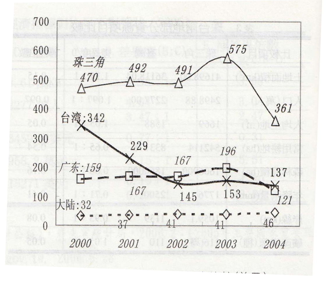 1)為具可比性,按當時匯率、由57.768億新台幣換算而來;2)台灣為佔製造業產值比重,珠三角為佔工業總產值比重;3)為具可比性,基於147.9億美元的地方財政收入估算得出;4)外貿依存度=出口值/GDP×100%;5)城鎮:35%,農村:42%。資料來源:2005廣東統計年鑑;「中華民國」統計資訊網www.stat.gov.tw