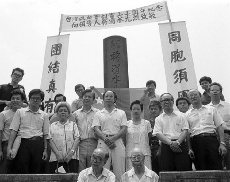 「同胞須團結、團結真有力。」台灣民眾黨創黨六十週年紀念、向領導人蔣渭水先烈致敬。攝影:蔡明德。前排左起:陳其昌(1931年接下總督府取締「台灣民眾黨」取締令的最後一任秘書長),周合源(日據時期新文化協會中央委員、萬華區「愛愛寮」三大幹部之一);第二排左二:蔣碧玉(「台灣民眾黨」創始人蔣渭水義女),第二排右一:廖天欣(日據時期抗日學生),第二排左三:黃溪南(「夏聯會」第一屆評委)第二排左四:王拓(「夏聯會」第一屆會長),第二排右三:楊祖珺(「夏聯會」第一屆評議長),第二排右二:王義雄(「夏聯會」第一屆秘書室評委),第三排左一:尚潔梅(「夏聯會」第一屆秘書),第四排手執「台灣民眾黨」黨旗左:王津平(「夏聯會」第一屆評委) ,第四排手執「台灣民眾黨」黨旗右:王曉波(「夏聯會」第一屆評委)。