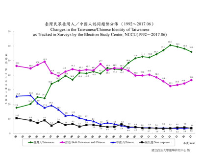 資料來源:政治大學選舉研究中心,重要政治態度分佈趨勢圖,2017年7月30日公布,http://esc.nccu.edu.tw/download.php?filename=166_b96998d1.jpg&dir=news&title=TaiwanChinese。
